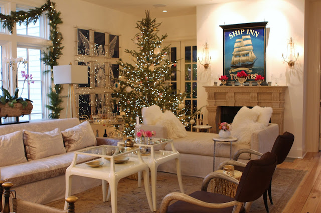 A large fresh tree stands in the corner- twinkling with small white lights.
