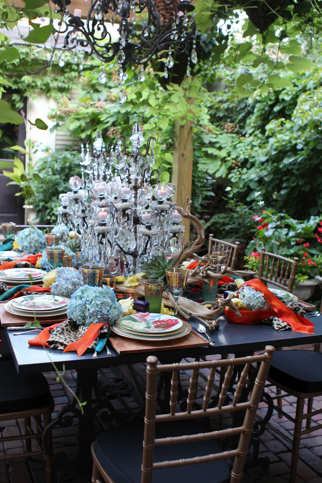 Last night, the Romancing the Home girls and friends were invited to dinner at Mariterese's 1800's brownstone in the city. She and her friend, Marcello, have been creating this marvelous little oasis in her back courtyard for several years, but this year it really came into it's own. A feeling of being in New Orleans immediately comes upon you upon entering this gem of a garden. Dinner was set under the pergola. First looking at the gorgeous table, jaws dropped as we carefully explored all the hidden details of this exquisitely decorated table. Vintage china mixed with new, hand dyed ribbon around fresh hydrangeas and yellow roses for the napkin rings, succulents on driftwood , waxed over candelabras and of course that little bit of leopard to pull it all together - a breathtaking table I must say. The top of the pergola was filled with magical lights from Frontgate that are solar powered and light up like diamonds after dark. Marcello filled the top of the pergola with moss filled baskets with flowing greens that filled the air. Clematis and trumpet vine were planted on the posts and then the ground was covered in moss - a charming touch. Roses fill containers and wisteria grows up the decking. As you listen to the fountain, you are sure you are in New Orleans having dinner at a 5 star restaurant. Dinner was amazing - Marcello- (did I mention that he also is a private chef?) prepared a gourmet meal for us, with Mariterese finishing it off with her Berry Cobbler. We left her home feeling like we had been on a mini-vacation, filled with inspirations for our own homes that we gathered from Mariterese's oasis in the city. Thank you for a most memorable evening. We will be joining www.betweennapsontheporch.net for Tablescape Thursday.